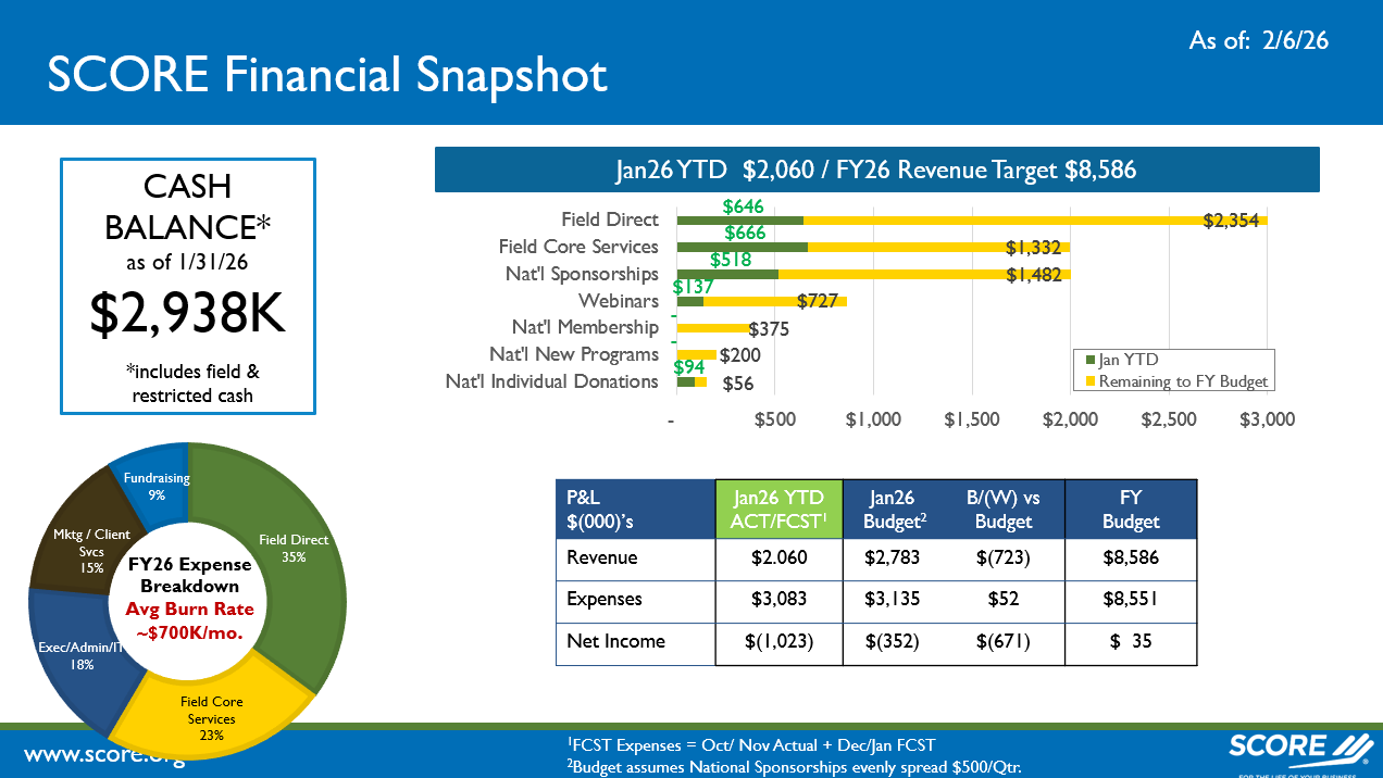 Access the latest monthly snapshots of SCORE’s financial performance to track progress against annual revenue goals, monitor operational expenses, and view updated cash flow projections.