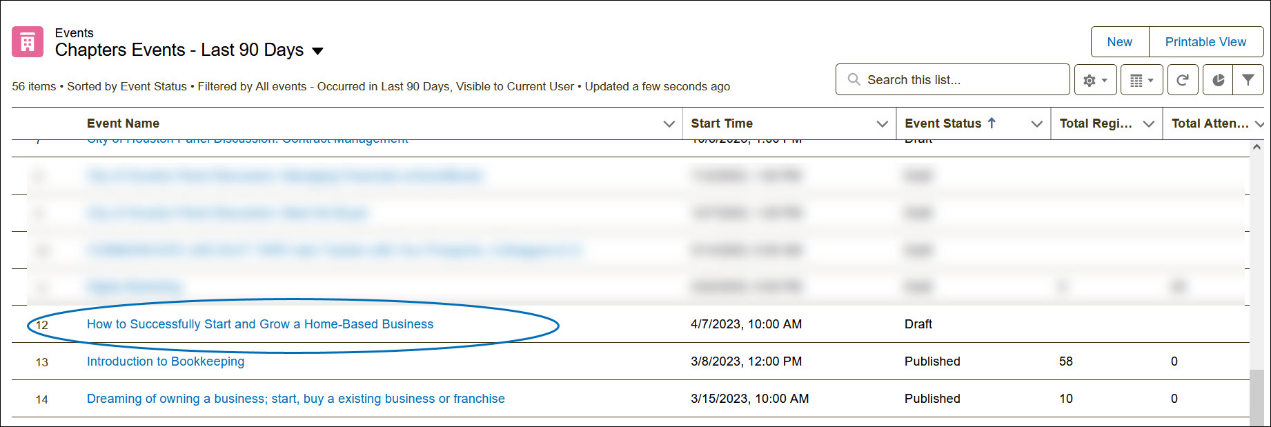 1A) From the Home Page, select Events - Last 90 Days. Note: Other list views can also be used here: Upcoming, Need Action, Completed.