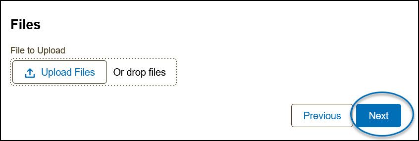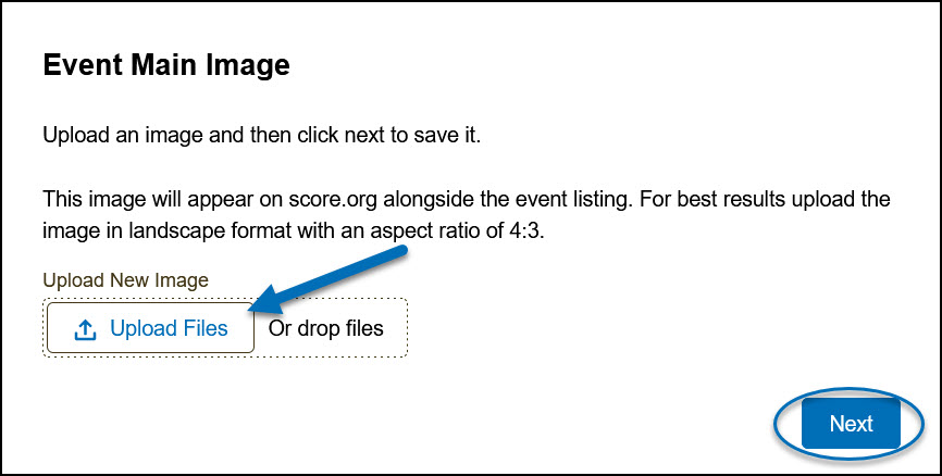 7) When applicable, upload documents or other file resources related to the event here. Click the Upload Files button or drag and drop the file. Then, click Next.