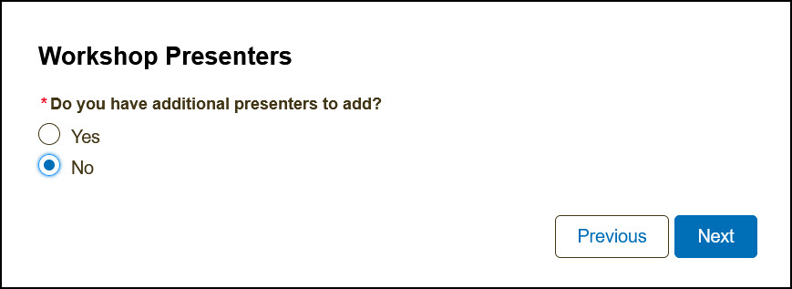 6b) If you want to add more SCORE Workshop Presenters and you can select Yes or No and then click Next.
