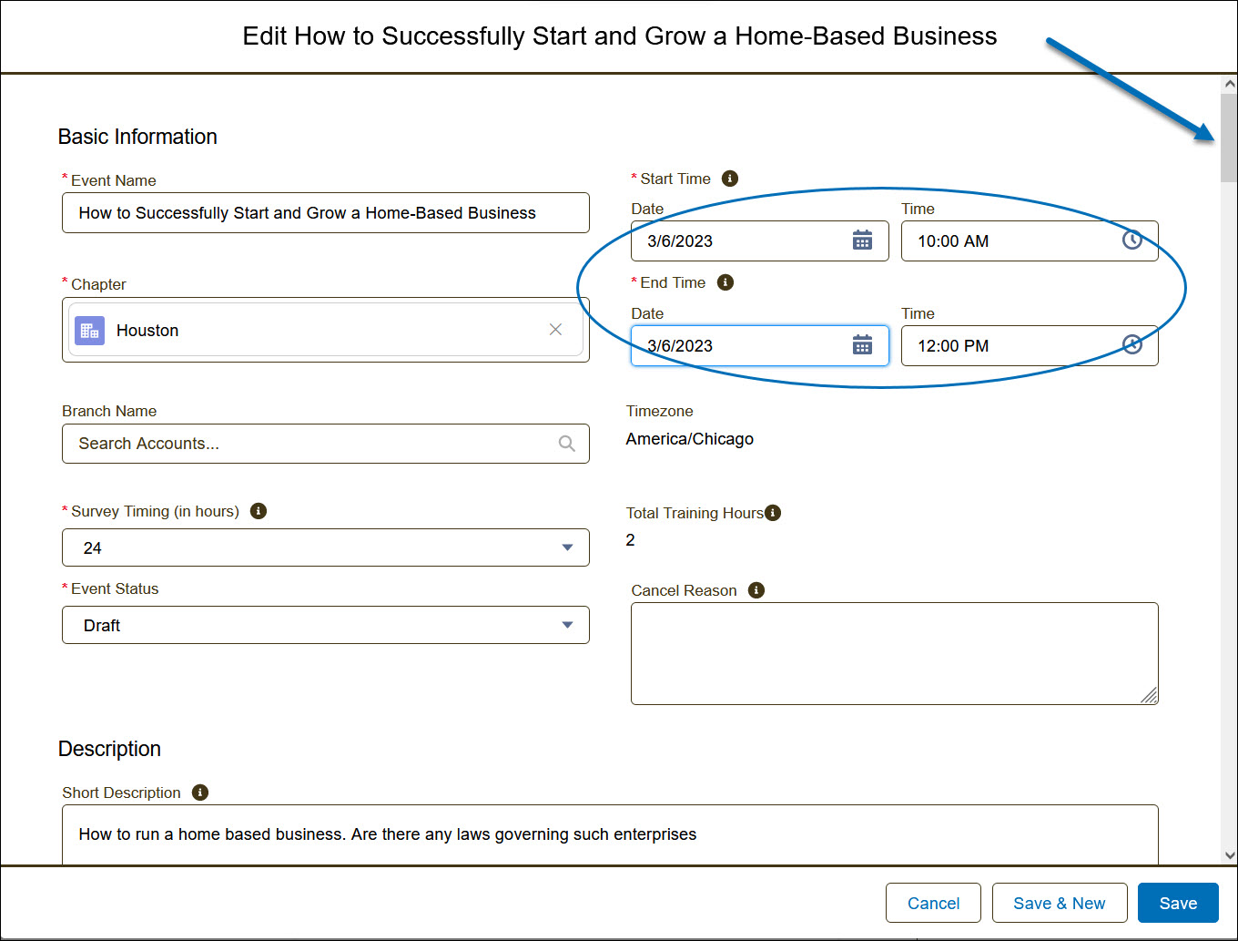 4) Now, you can edit the Start Date and Time and End Date and Time and your Event Status to Draft. Also, scroll down to the other event details you may want to modify or review using the scroll bar on the right e.g. Close Registration on Date, Early Bird Discount Date, etc.