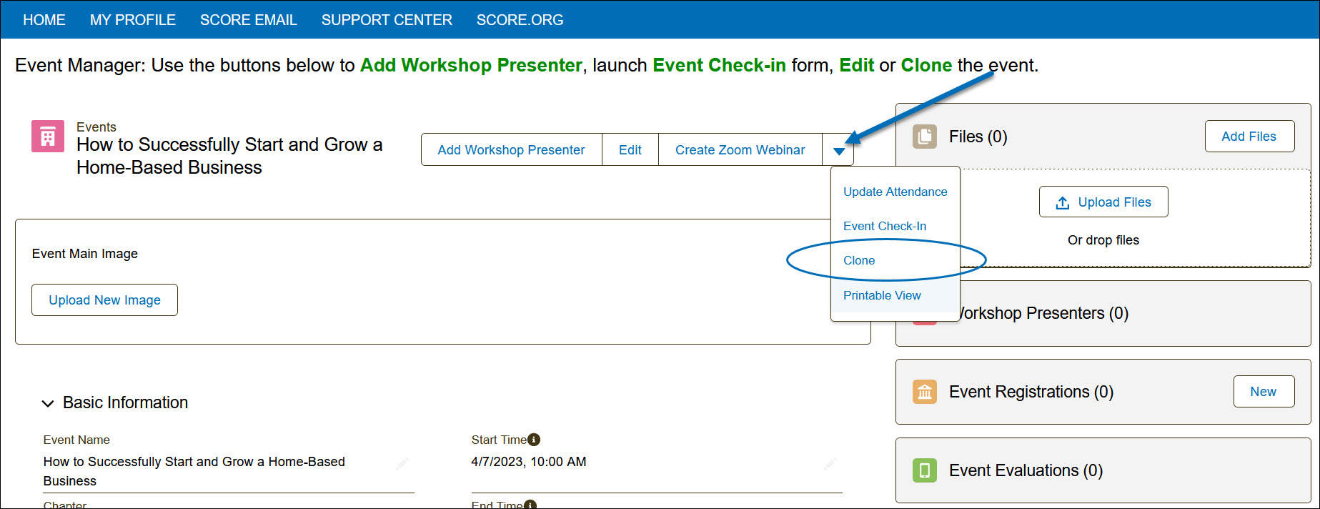 - Cloning an event is limited to only copying the details of the event record and will not clone the event image, workshop presenter, or uploaded file.