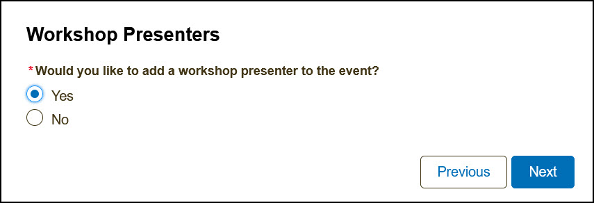 6) The next window will allow you to add a SCORE Workshop Presenter. Select Yes if adding one during the creation or you can always modify the event later to add the Workshop Presenter. Click Next. Click No if you are not adding any workshop presenters at this time.