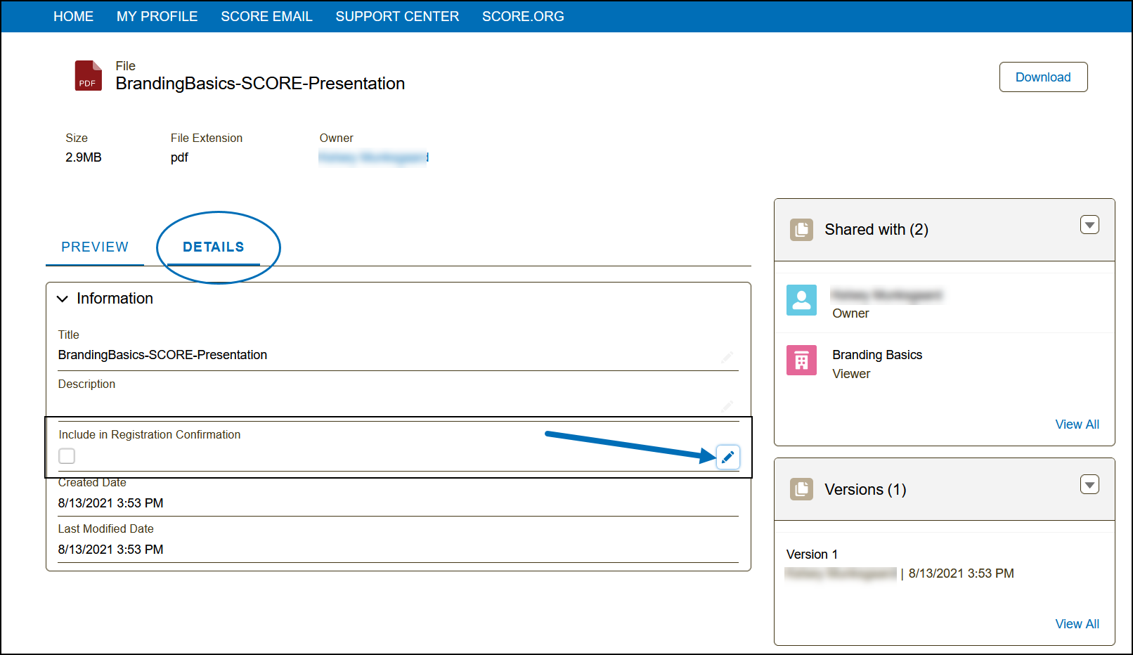 5) On the next page that opens, click the pencil icon to edit the option to include the selected file in the Registration Confirmation Email.