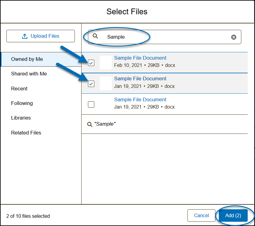 - Search the document you wish to upload in this event, select them by clicking the checkbox next to the file, and click Add. Note: You can upload up to 10 files at a time.