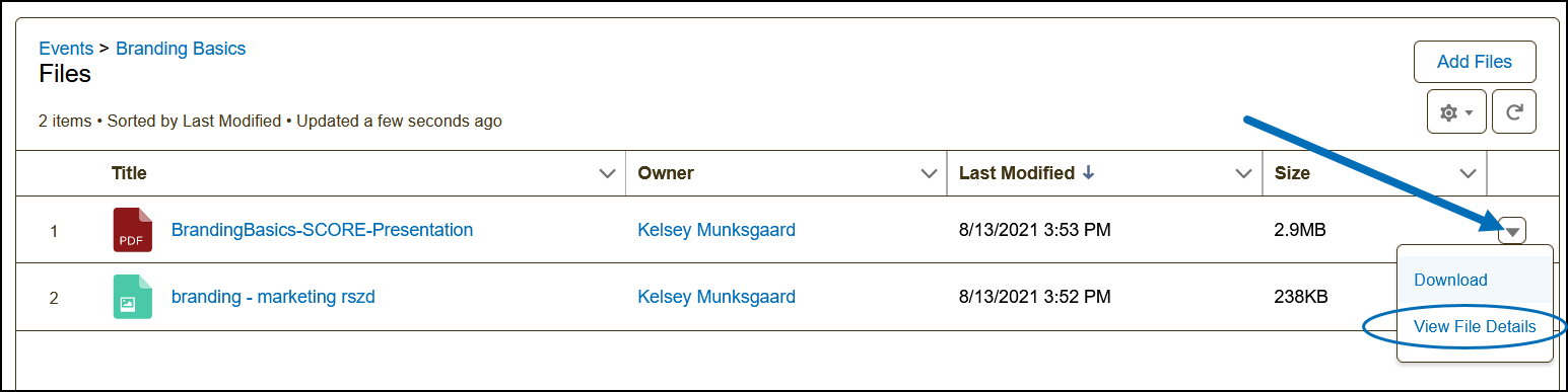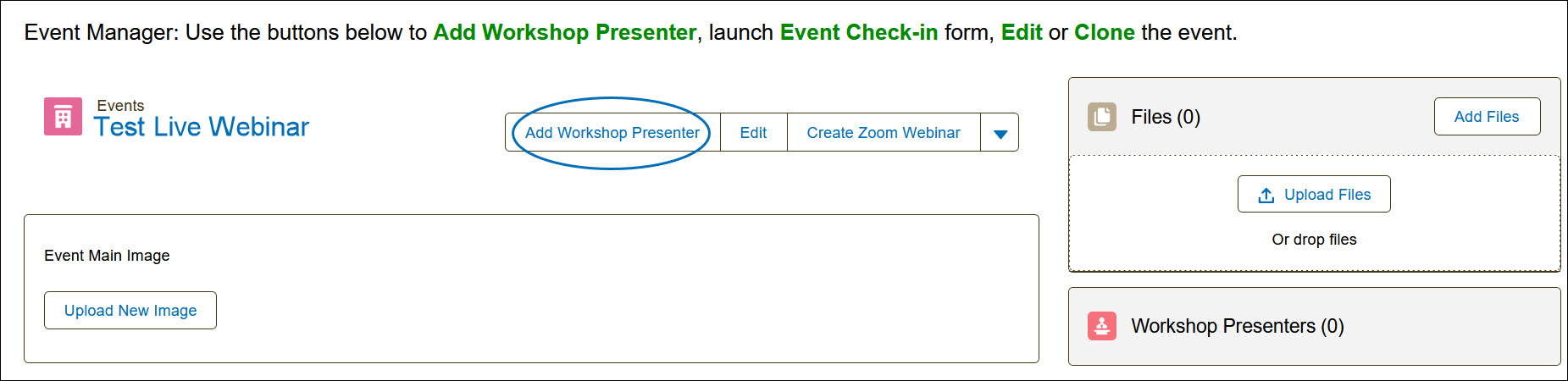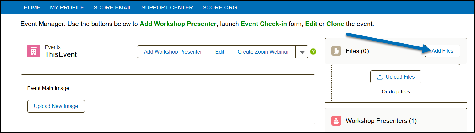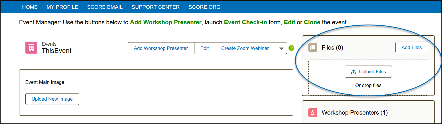 - Use Upload Files if you are adding a file from your local drive to the Event page for the first time. Or you can drag and drop files from your computer.