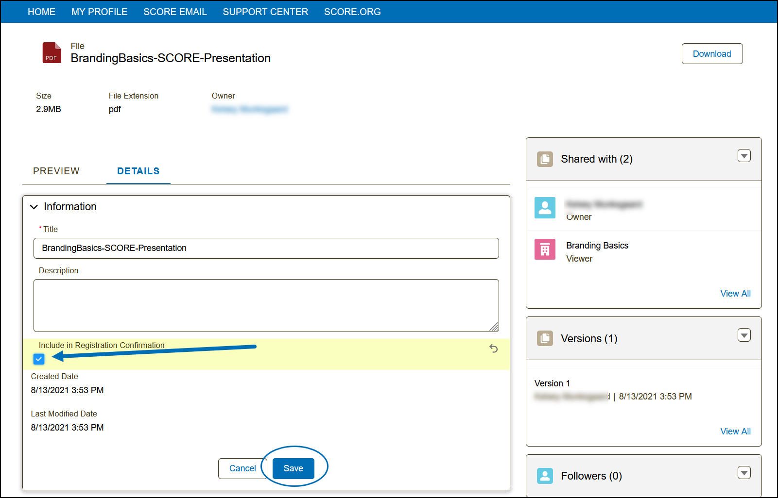 6) Check the box to Include (the file) in Registration Confirmation and then click Save. The file will be included in the Registration Confirmation Email sent to registrants.