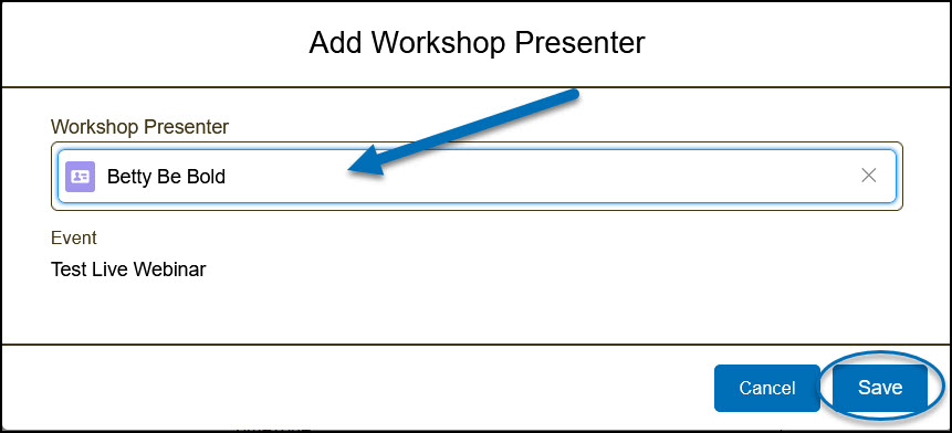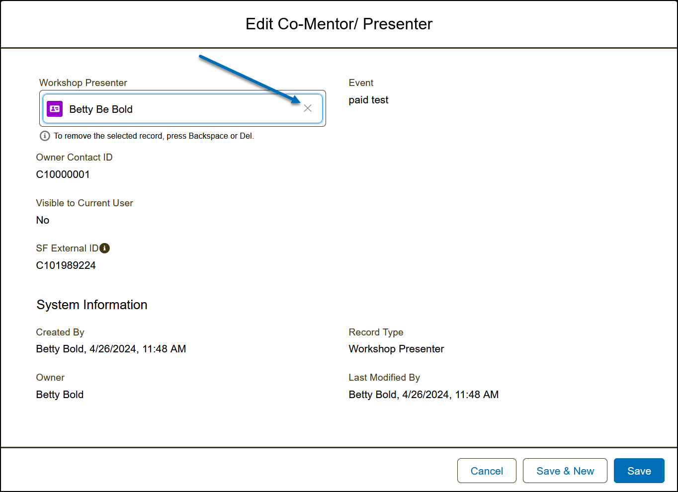 - To remove the Workshop Presenter (WP), click the X next to their name in the Workshop Presenter field.