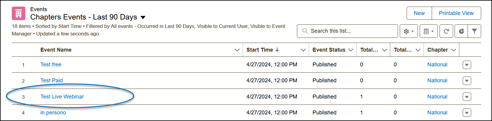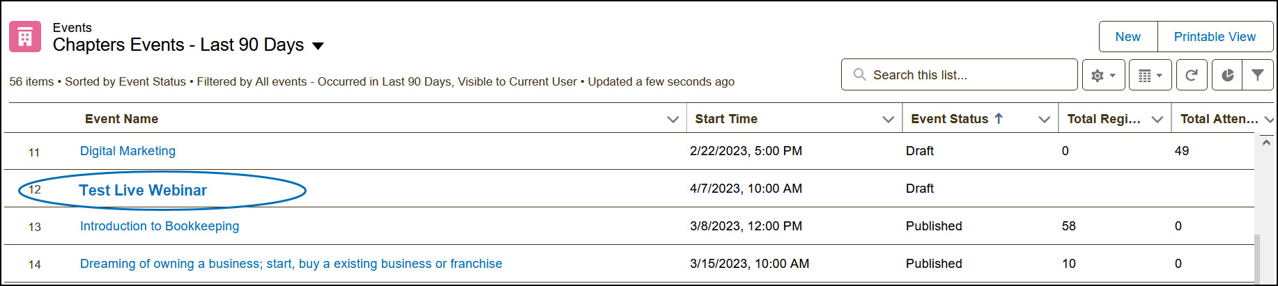 1) From the Home Page, select Events - Last 90 Days. Note: Other list views can also be used here: Upcoming, Need Action, Completed.