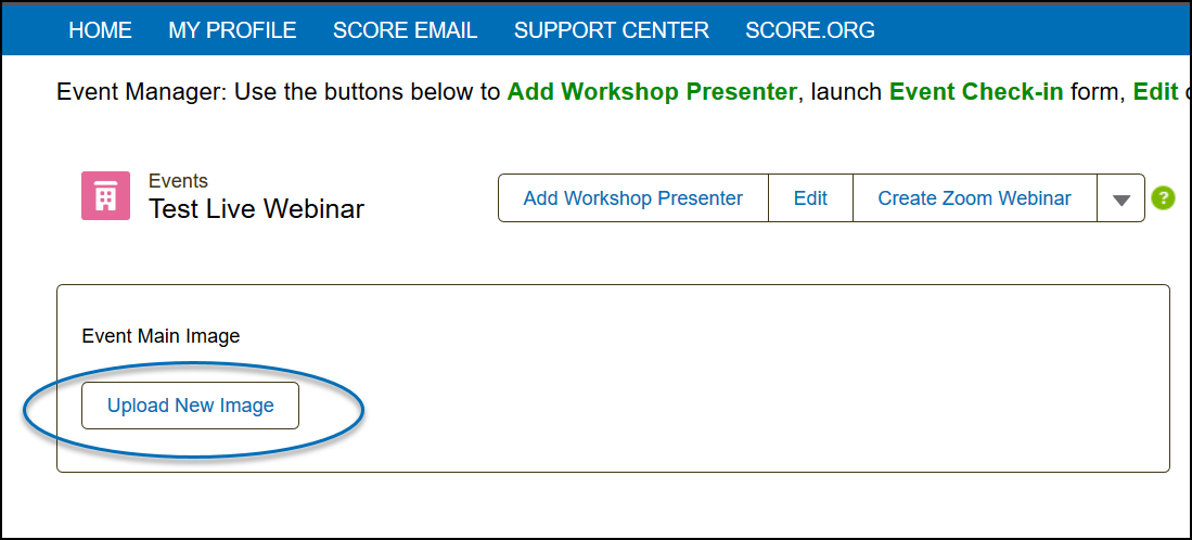 3) On the top of the event record page is a section for the Event Main Image. Click the Upload New Image button.