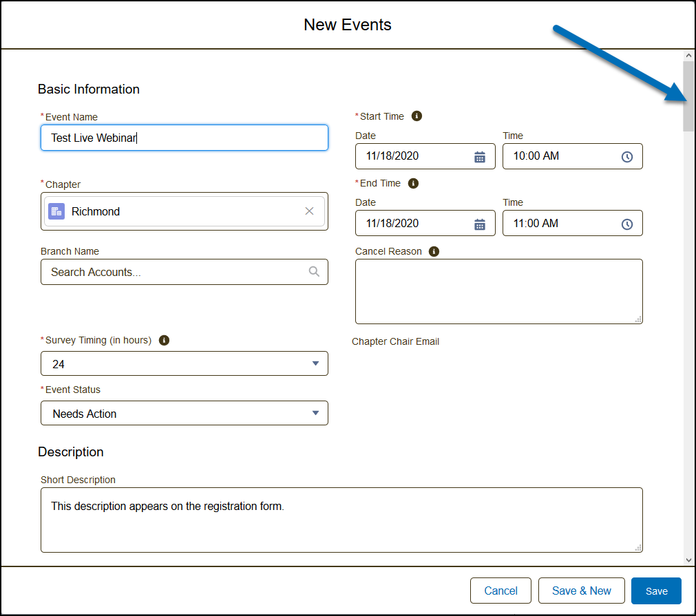 4) Enter new or updated existing information. Also, scroll down to the other event details you may want to modify or review using the scroll bar on the right. If you are missing the scroll bar, please review the Best Practices for Mac Users. When done, click the Save button.