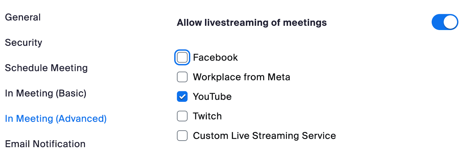 - You must enable live streaming once in your Zoom account. Go to “Settings” and under “in meeting” (advanced), and you will find the option to live stream meetings and webinars to several channels, including YouTube.