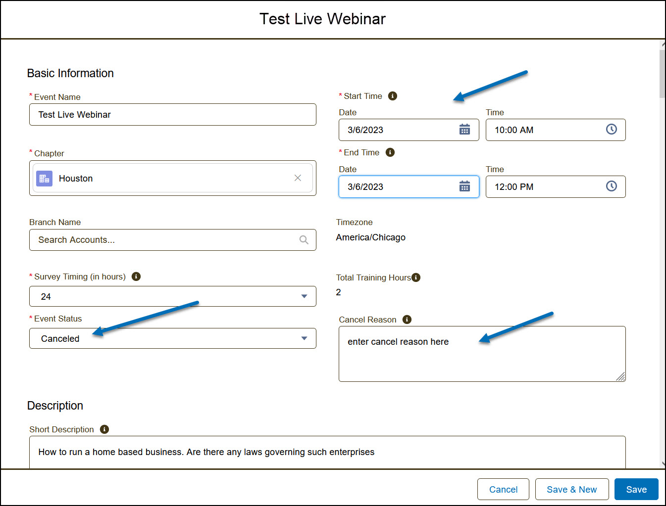 • Event Managers should change the start and end date to the current date when canceling a past event
