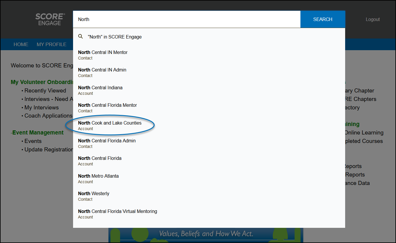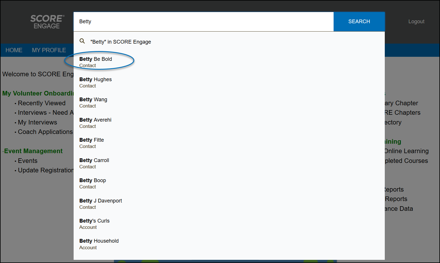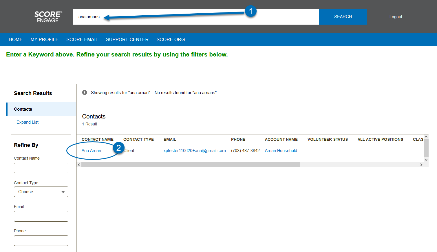 1) On the SCORE Engage Home page, use global search to search for a Contact.