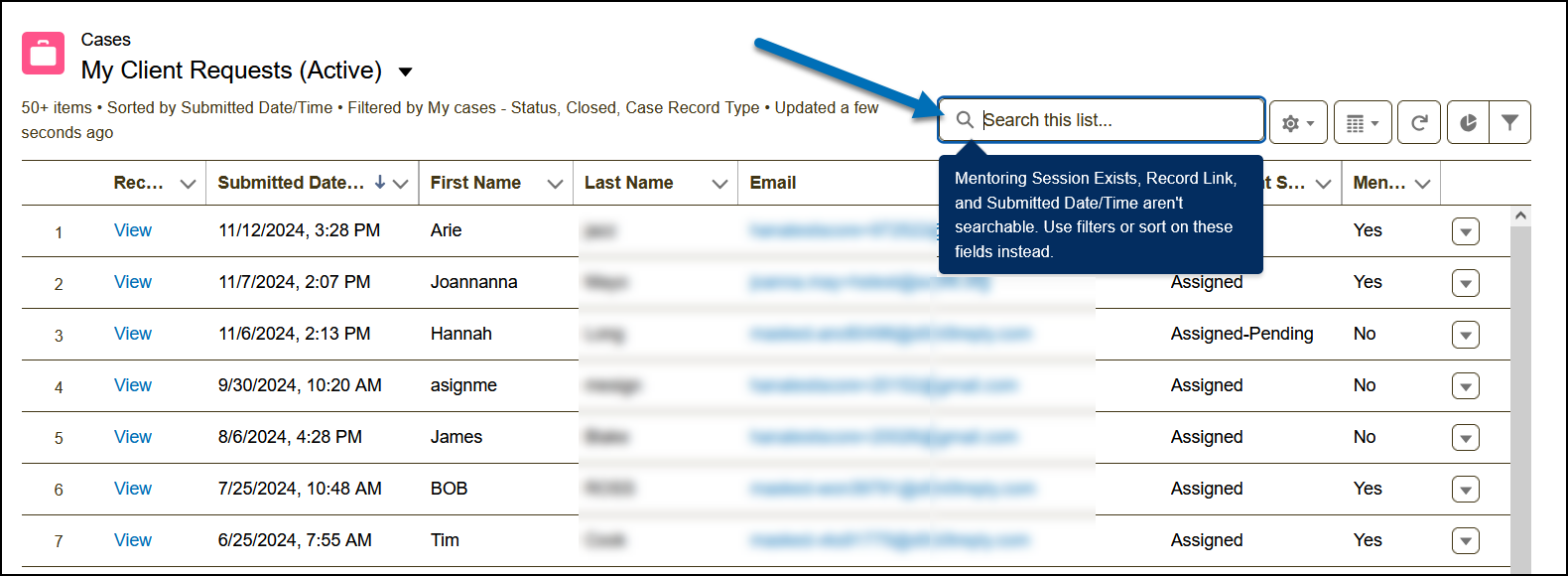 4) If you're looking to check if the client already has an existing mentoring request but do not see anything under the Mentoring Requests related list, click the Add/Edit Session button.