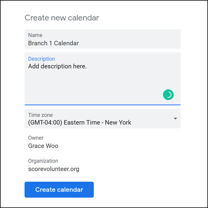 Note: Google Calendar is a Google application included in your @scorevolunteer.org account. It is free to use and every chapter member has one.