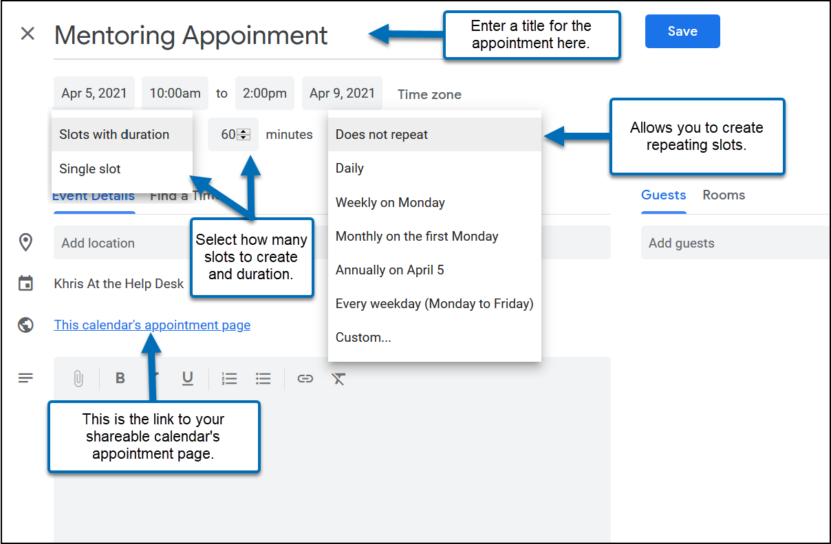 This article covers how to setup and manage the Appointment Slots feature in your SCORE's Google Calendar. If you're looking for the new feature of using Appointment Schedule instead of Appointment Slots, please go to this guide: Google Calendar - Using the Appointment Schedule Feature