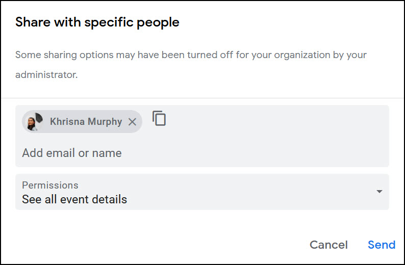 3) Enter the name or email address and set permissions then, click Send. Google will send a notification email with the link of your calendar to the person you've added.