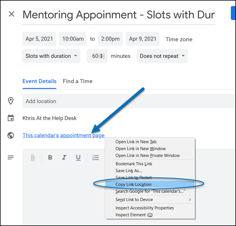 3) Next, copy the link by right-clicking (Control key and click in Mac) ‘This calendar’s appointment page’ then choose the Copy link address option. You can then paste this link in an email to your clients if they want to see your mentoring schedule.