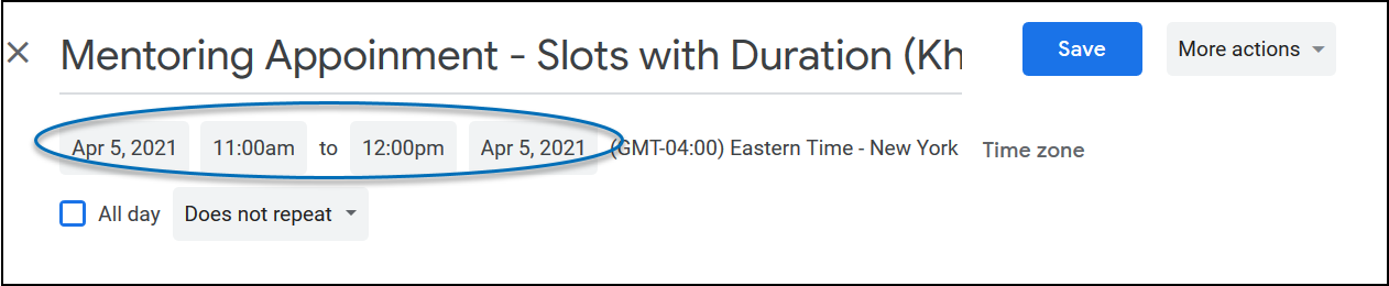 2) In your Google Calendar, select the date/time and click the pencil icon
