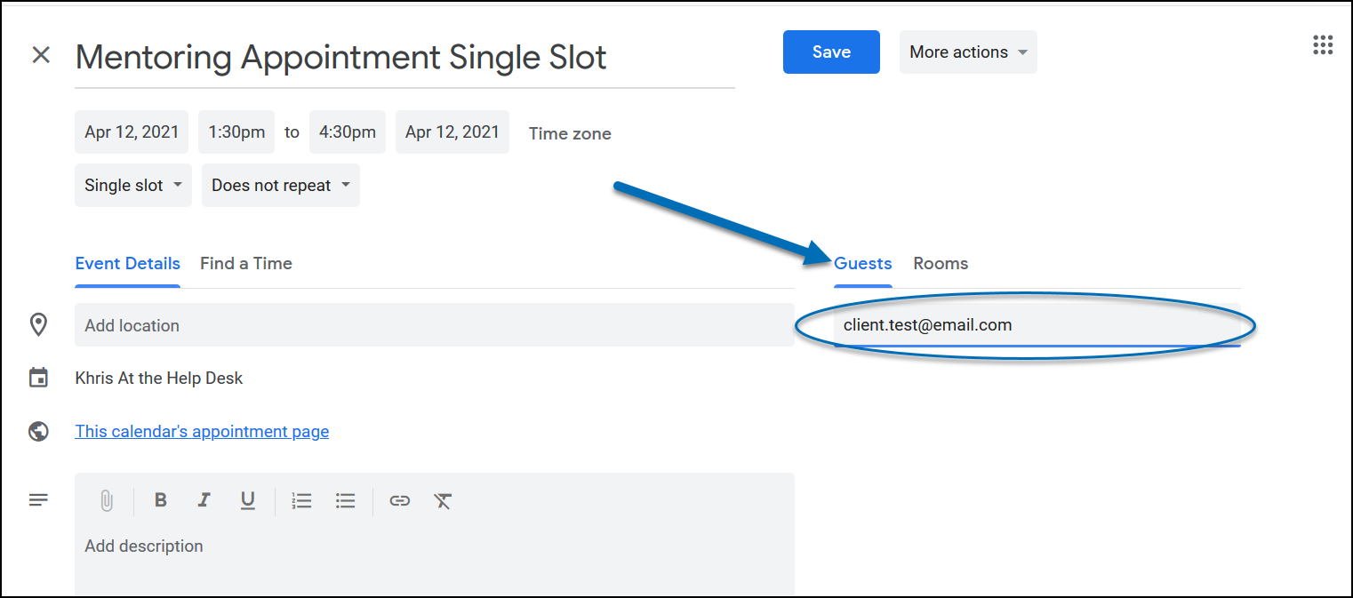 Note: Aside from adding clients as guests to an appointment, you can also add co-mentors and/or provisional mentors to your appointment by adding them as guests.