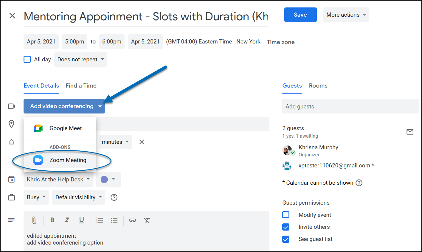 3) Click Add Video Conferencing and select Zoom Meeting from the drop-down. Zoom will now create a meeting and add the details on this page. Note: Your @scorevolunteer.org account has a Zoom account associated with it. Make sure you are using your @scorevolunteer.org account to see this add-on as one of your options.