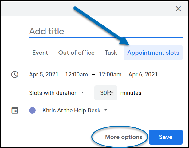 3) In the event box that will open, select Appointment Slots. Then click More Options.