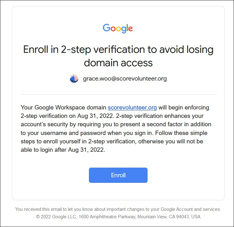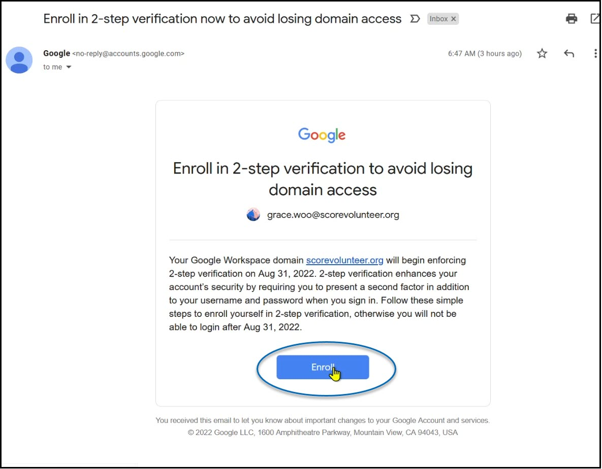 1) Open the email message from Google regarding turning on the 2-step verification and click Enroll.
