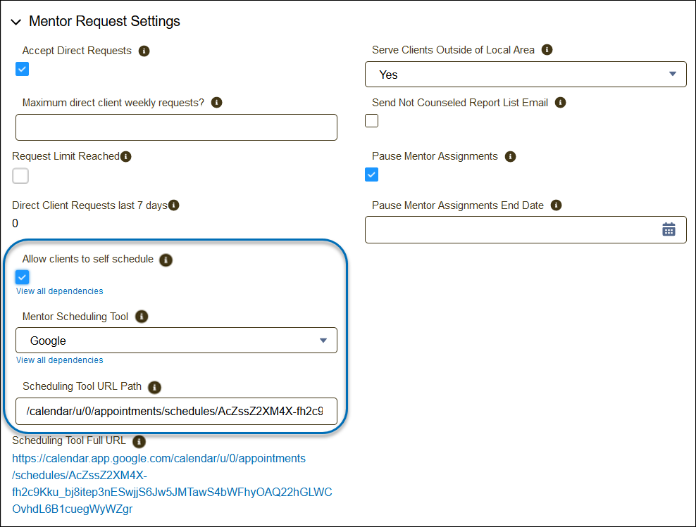 Note: If you are allowing clients to self-schedule, then you MUST select a mentoring scheduling tool and you MUST enter the scheduling tool URL path. These three fields are interdependent and must be filled out or completed to allow clients to self-schedule effectively.