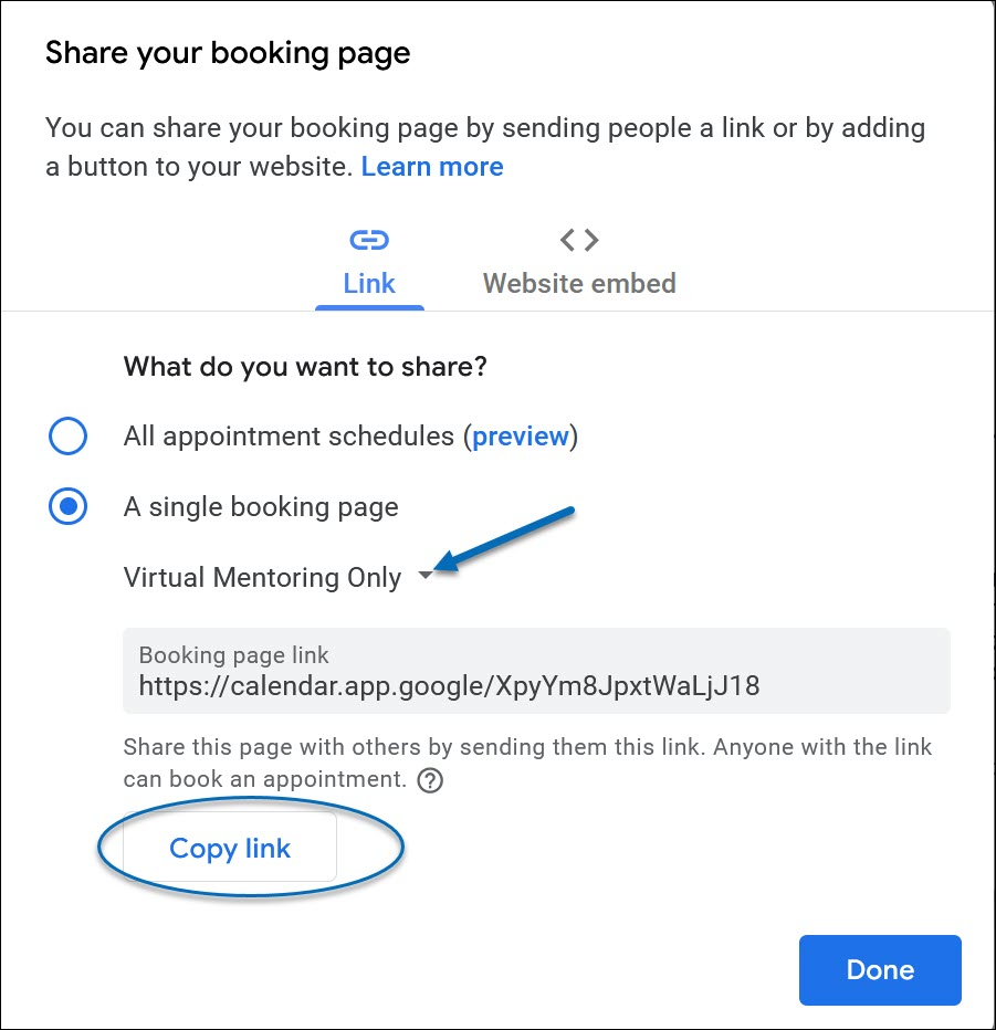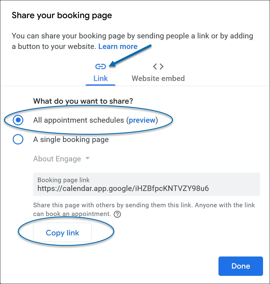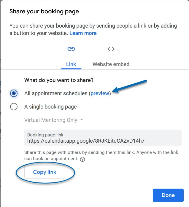 3) Then, select All Appointment Schedules and click Copy Link. Click Done to close the pop-up window. To create multiple booking pages/appointment schedules, please see Creating Different Booking Pages.