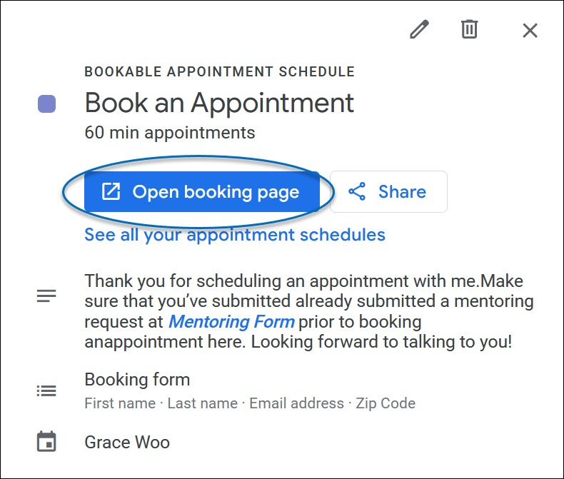 1) Your Booking Page can be accessed by clicking any of the appointment schedule in your Google Calendar then selecting Share.