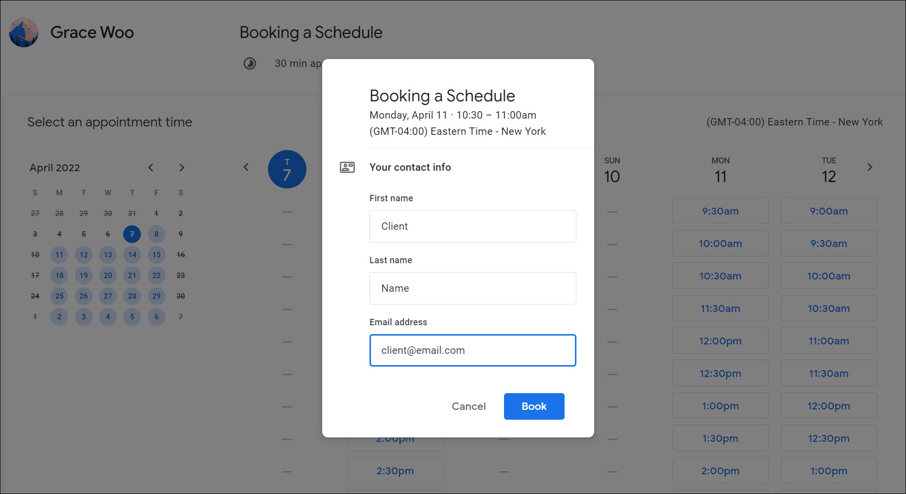 2) When the client selects the appointment time, they will be prompted to complete the booking form. And then click Book when done.