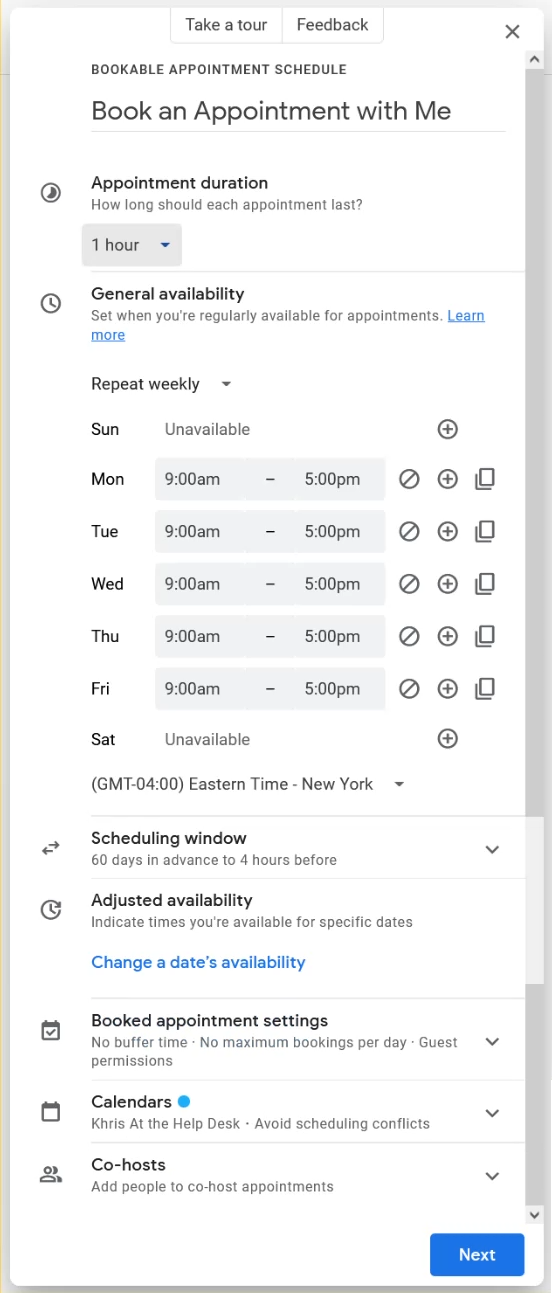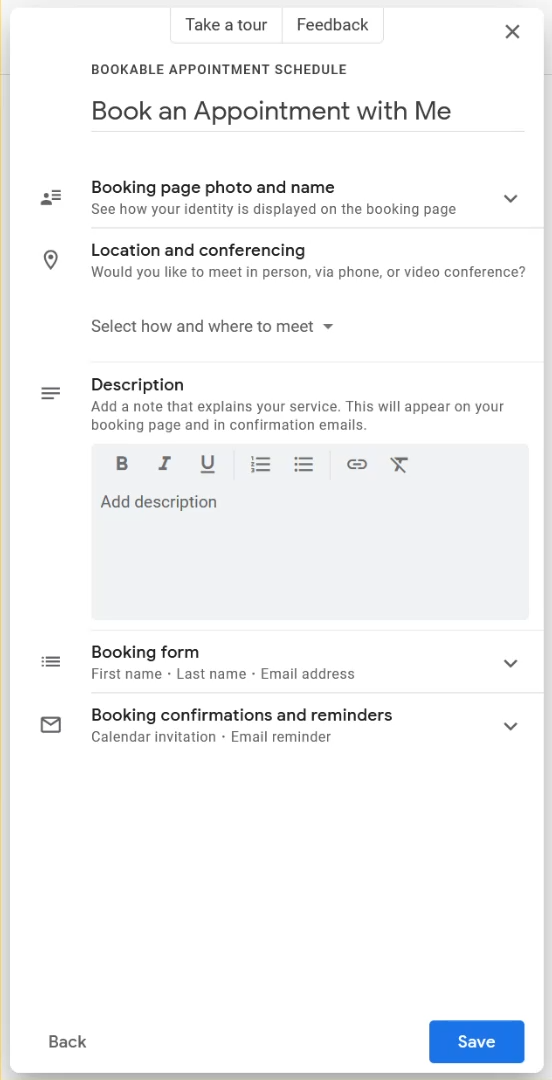 The Appointment Schedule is Google Calendar's main scheduling setup. As of August 2024, Google Calendar removed its appointment slots feature, and you can read more information about it here.