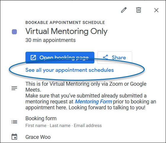 4) This will open up a new window with all the appointment schedules you've created in your Google Calendar.
